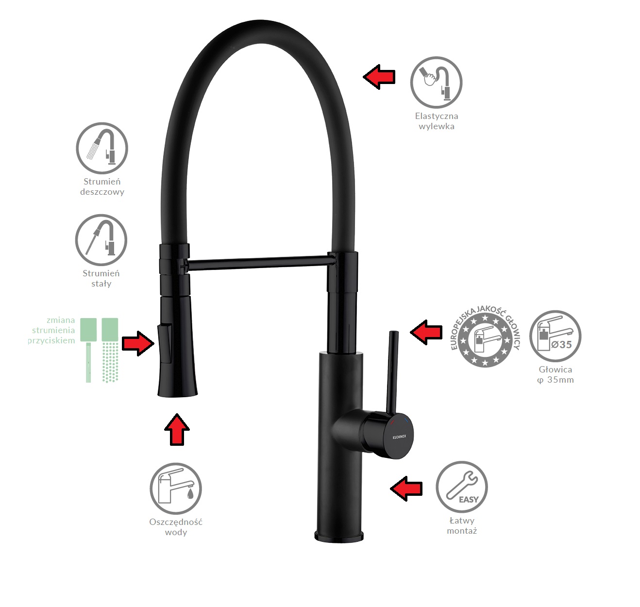 Bateria posiada wygodną, elastyczną wylewkę oraz głowicę ceramiczną z Europejską Jakością.