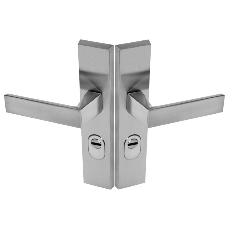 Klamka zewnętrzna QUALIA na długim podwójnym i stalowym szyldzie jest klasycznym rozwiązaniem. Łączy w sobie prostotę i elegancję.