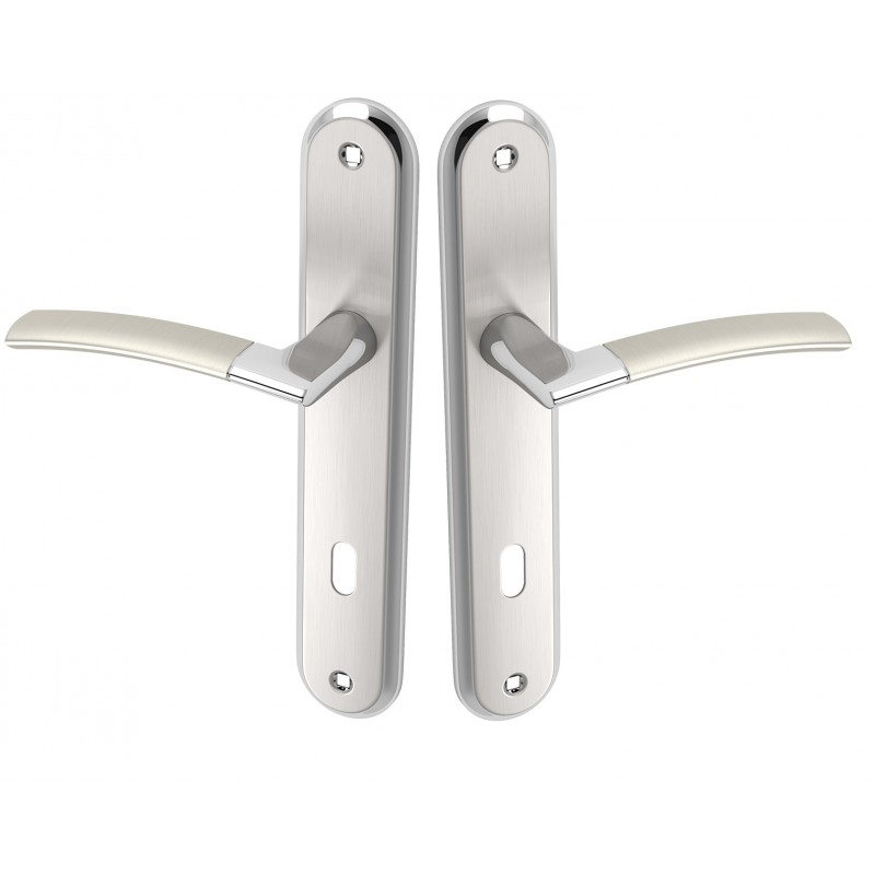 ✅ Otrzymasz klamkę na Długim Szyldzie z przebiciem na klucz w wykończeniu Satyna / Chrom o łagodnej linii.