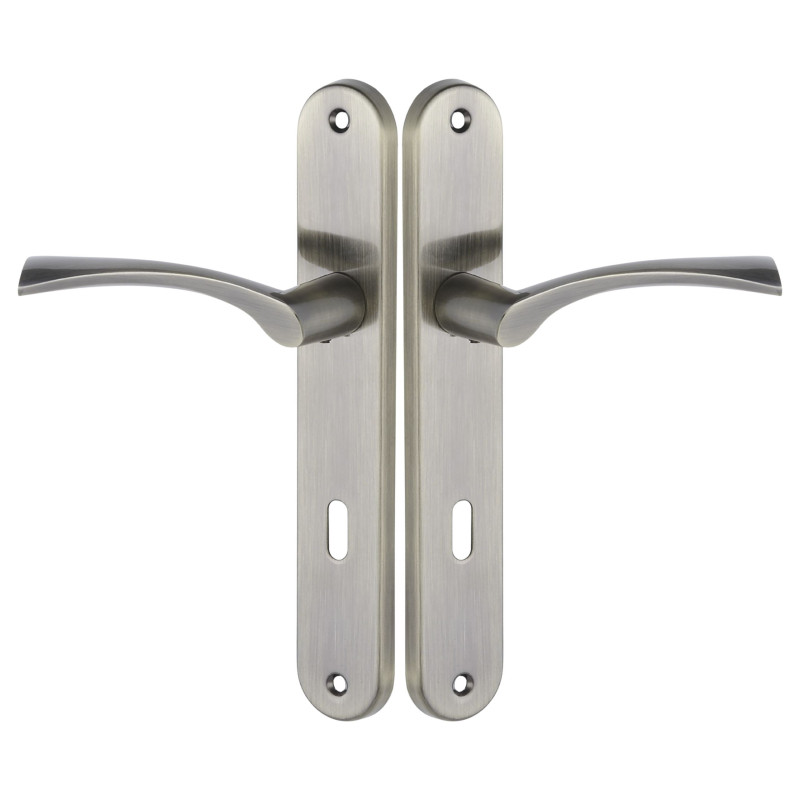 - Design i Charakter: Patynowe wykończenie to synonim szlachetnej klasyki, doskonale komponującej się z tradycyjnymi i nowoczesnymi przestrzeniami. Długi szyld z otworem na klucz tworzy spójny i estetyczny detal.