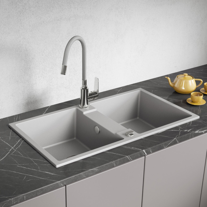 ✅ Otrzymasz zlewozmywak granitowy wpuszczany w blat w szarym wykończeniu.