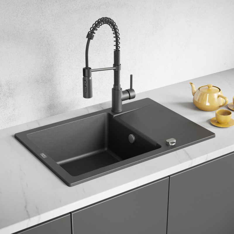 ✅ Otrzymasz zlewozmywak granitowy wpuszczany w blat w czarnym wykończeniu.