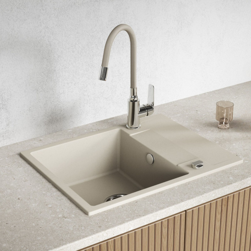 ✅ Otrzymasz zlewozmywak granitowy wpuszczany w blat w beżowym wykończeniu.