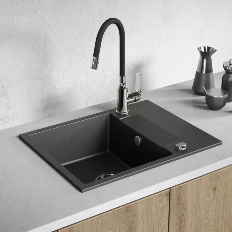 ✅ Otrzymasz zlewozmywak granitowy wpuszczany w blat w czarnym wykończeniu.