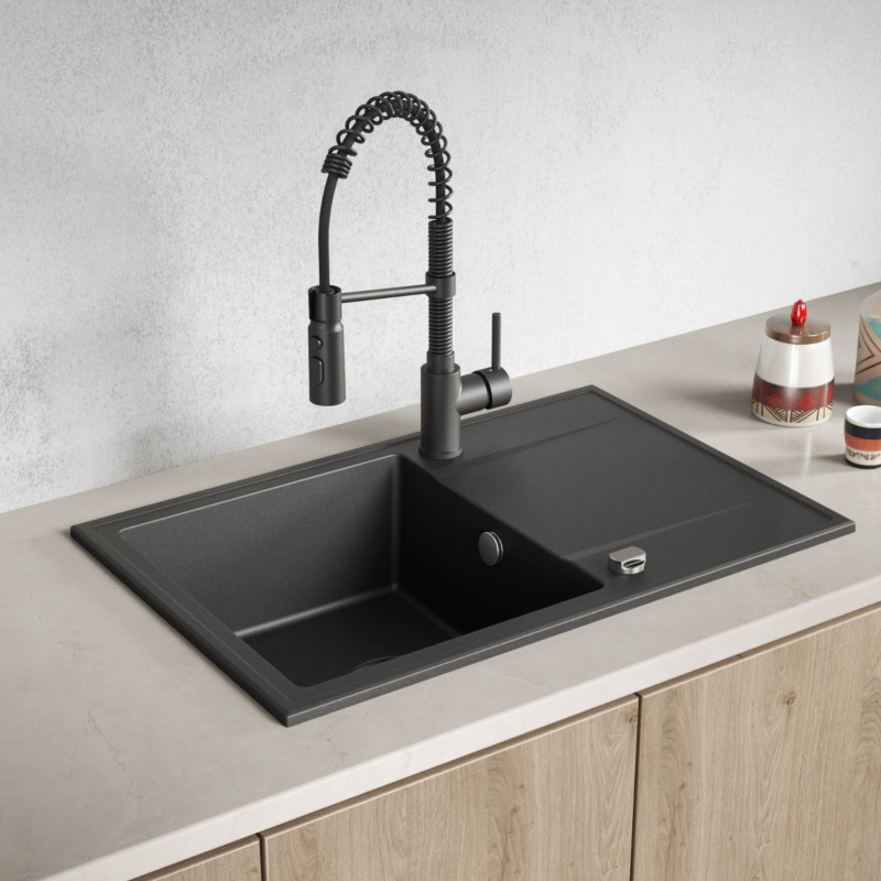 ✅ Otrzymasz zlewozmywak granitowy wpuszczany w blat w czarnym wykończeniu.
