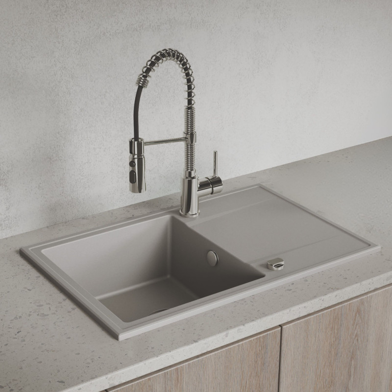 ✅ Otrzymasz zlewozmywak granitowy wpuszczany w blat w szarym wykończeniu.
