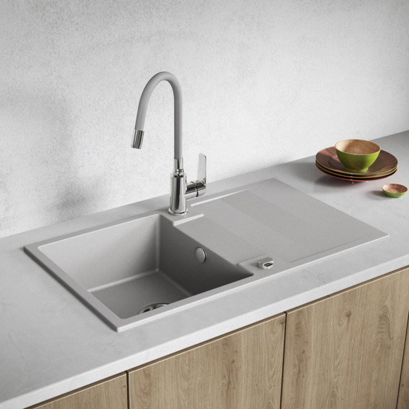 ✅ Otrzymasz zlewozmywak granitowy wpuszczany w blat w szarym wykończeniu.