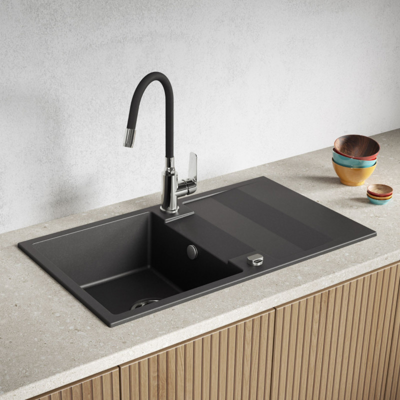 ➡️ Granit to jeden z najlepszych materiałów do produkcji zlewozmywaków, a jego zalety są nieocenione. Jest niezwykle twardy i odporny na codzienne użytkowanie – nie straszne mu zarysowania, przebarwienia czy uderzenia. Co więcej, jest odporny na szok termiczny do 250°C, więc możesz bez obaw wylewać do niego gorącą wodę. To materiał, który gwarantuje trwałość i estetyczny wygląd na wiele lat, sprawiając, że Twój zlew zawsze będzie wyglądał jak nowy.
