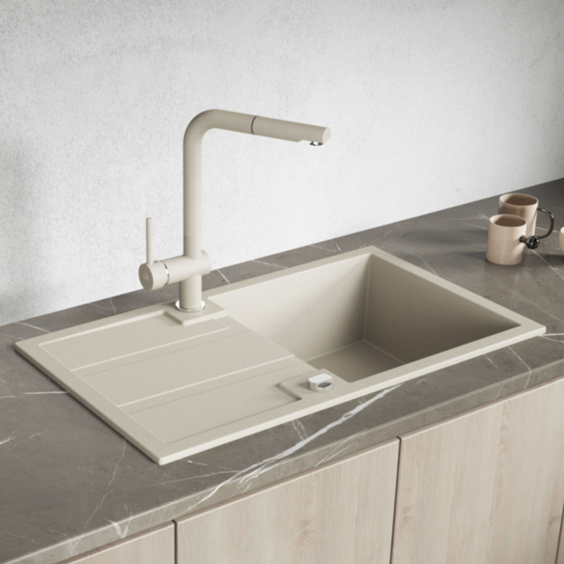 ✅ Zyskaj solidny produkt na lata w modnym, geometrycznym wzorze, wybierając beżowy zlewozmywak jednokomorowy! Ciesz się wygodnym ociekaczem, na którym bez problemu wysuszysz naczynia i produkty spożywcze. Ten ergonomiczny i odwracalny zlew idealnie dopasuje się do Twojej kuchni. Przekonaj się, jak wygodne automatyczne zamknięcie odpływu oraz specjalny syfon Space Saving ułatwią Ci codzienne prace. Postaw na trwałość – zlewozmywak jest odporny na szok termiczny, uderzenia, zarysowania, przebarwienia i wysoką temperaturę!