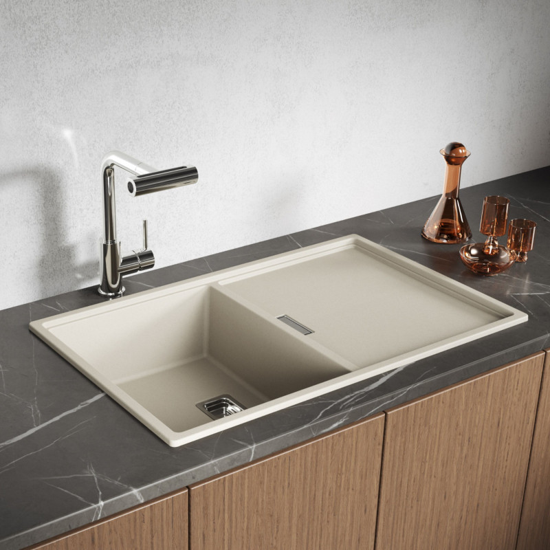 ➡️ Ciepły, beżowy kolor oraz deklarowana w specyfikacji bardzo wysoka odporność na zarysowania, uderzenia mechaniczne, powstawanie przebarwień, szok termiczny oraz działanie wysokiej temperatury (aż do 250°C) bardzo silnie sugerują, że zlewozmywak Tonga jest wykonany z wysokiej jakości kompozytu granitowego. Jest to nowoczesny materiał, będący mieszanką mielonego naturalnego granitu (stanowiącego ok. 80% masy) oraz dedykowanych żywic akrylowych, który charakteryzuje się właśnie takimi doskonałymi właściwościami użytkowymi i estetycznymi.