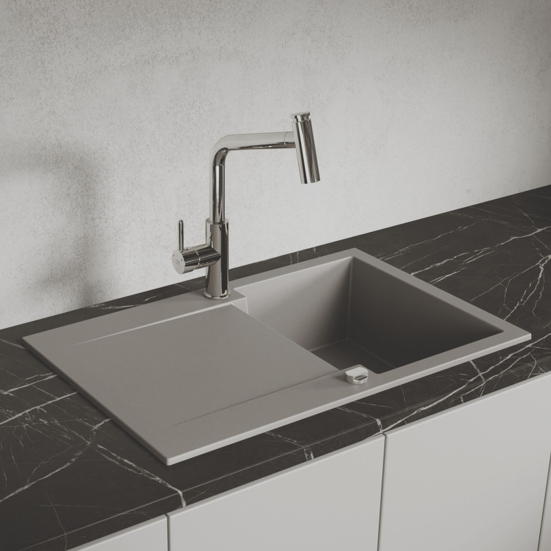 Zlewozmywak granitowy Chichi w kolorze szarym to doskonała propozycja dla osób poszukujących maksymalnej wygody i klasycznej elegancji. Model ten, wyposażony w pełny, długi ociekacz, został zaprojektowany z myślą o szafkach o szerokości minimum 80 cm. Łączy on obszerną strefę roboczą z niezawodnością naturalnego surowca, stając się sercem kuchni. Polska produkcja gwarantuje solidność wykonania, której możesz zaufać przez lata.