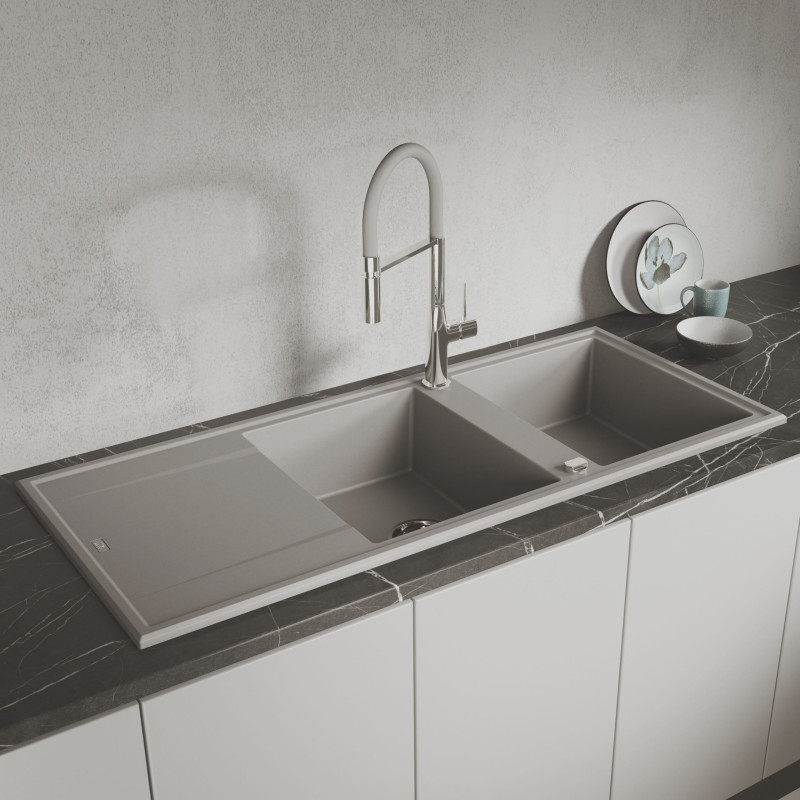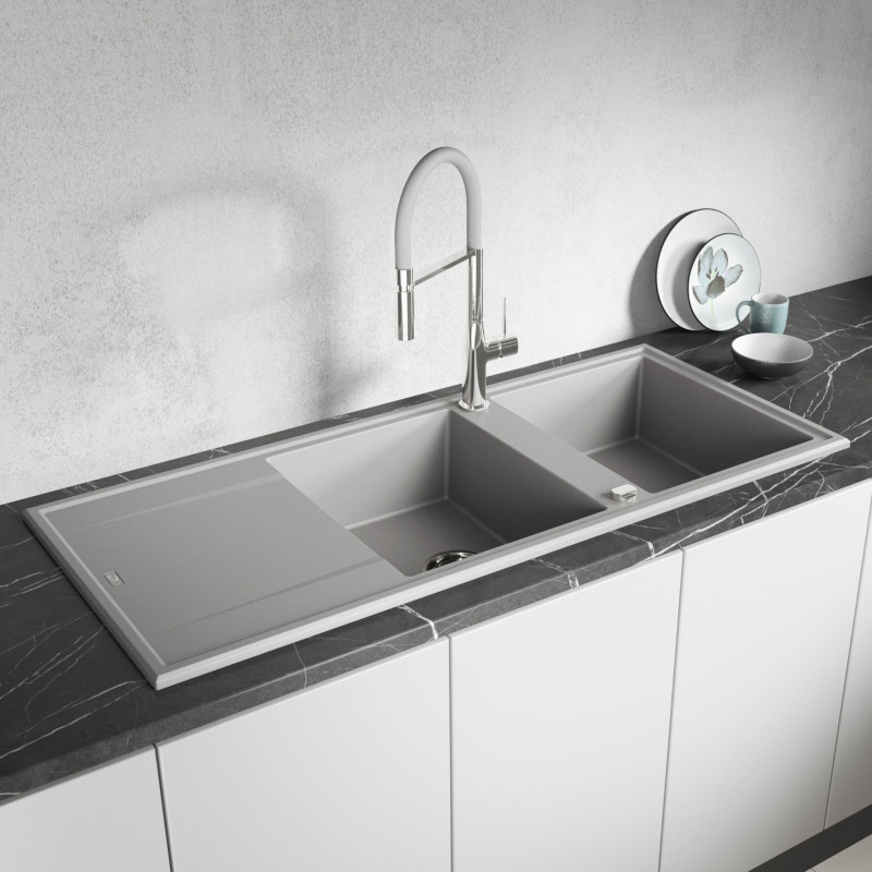 ✅ Zyskaj solidny produkt na lata w modnym, geometrycznym wzorze, wybierając szary zlewozmywak granitowy Megalo! Ciesz się dwoma pojemnymi komorami oraz wygodnym, długim ociekaczem, który umożliwi Ci swobodne suszenie naczyń i produktów spożywczych. Jego idealnie gładka powierzchnia ociekacza ułatwi utrzymanie czystości i zminimalizuje ryzyko powstania zacieków, a rant o wysokości 20 mm wokół zlewozmywaka zmniejszy ryzyko rozlania wody na blat. Ten ergonomiczny i odwracalny zlew idealnie dopasuje się do Twojej kuchni, a wygodne automatyczne zamknięcie odpływu oraz specjalny syfon Space Saving ułatwią codzienne prace. Postaw na trwałość – zlewozmywak jest odporny na szok termiczny, uderzenia, zarysowania, przebarwienia i wysoką temperaturę!