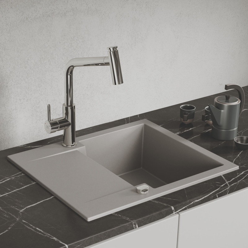 Zlewozmywak granitowy Chichi w nowoczesnym odcieniu szarości to perfekcyjny wybór dla osób, które chcą maksymalnie wykorzystać przestrzeń w kuchni, nie rezygnując z wygody. Ten jednokomorowy model z praktycznym półociekaczem został stworzony z myślą o szafkach o szerokości minimum 60 cm. Łączy w sobie elegancję naturalnego kamienia z przemyślaną ergonomią, stanowiąc solidny fundament każdej strefy zmywania. Produkt wytwarzany w polskich fabrykach gwarantuje najwyższą jakość wykonania.