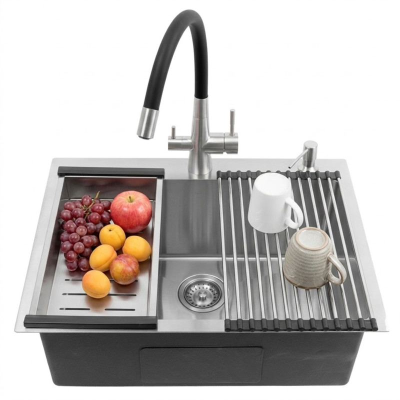 ▶️ Zintegrowany ociekacz zlewu: Ten model zlewu jest bez zintegrowanego ociekacza formowanego w korpusie, oferując w zamian znacznie bardziej wszechstronny i mobilny ociekacz zwijany.